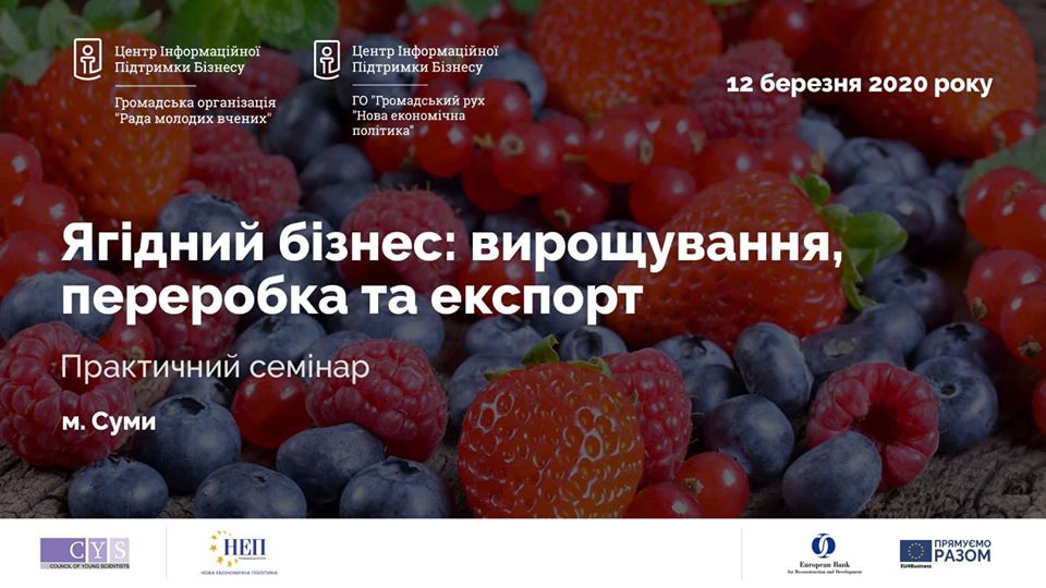 Центр інформаційної підтримки бізнесу м.Суми, який функіонує на базі ГО “Рада молодих вчених”, за підтримки Європейського банку реконструкції та розвитку 12.03.2020 року буде проводити практичний семінар “Ягідний бізнес: вирощування, переробка та експорт”. Захід орінтований на власників, керівників та провідних спеціалістів, що представляють сферу малого та середнього бізнесу. участь у семінарі безкоштована, реєстрація обовязкова за посиланням : https://form.jotformeu.com/200231148201334/…